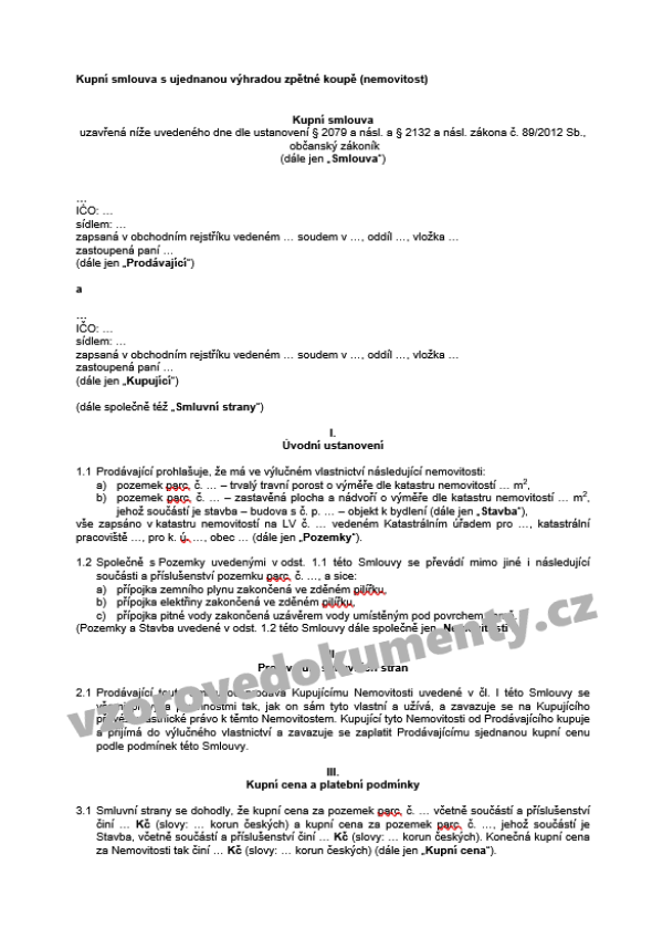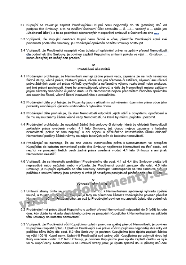Chcete koupit nemovitost a zároveň si nechat otevřená zadní vrátka? Tento vzor řeší bezpečný převod, úschovu kupní ceny a věcněprávní výhradu zpětné koupě podle občanského zákoníku – připraveno k vyplnění a okamžitému použití.