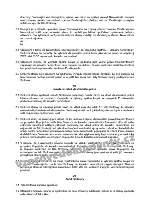 Výhradu zpětné koupě jako věcné právo – přesná lhůta pro uplatnění (až 5 let), mechanismus úplaty (100 % / 90 % kupní ceny dle času), povinnost vrátit nemovitost v nezhoršeném stavu a zákaz zatížení bez souhlasu prodávajícího.